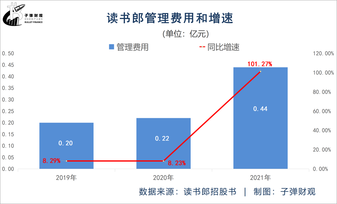 一来,读书郎的管理费用在增加。根据招股书,2021年读书郎的管理费用为0.44亿元,较上年同期的0.22亿元增长超一倍,达到101.27%。