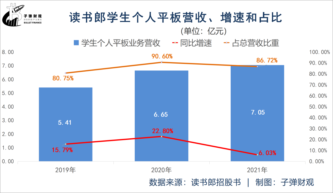 此外,最近3个年度,读书郎的学生个人平板业务为公司贡献的营收比重一直在80%以上,依次为80.75%、90.60%和86.72%。