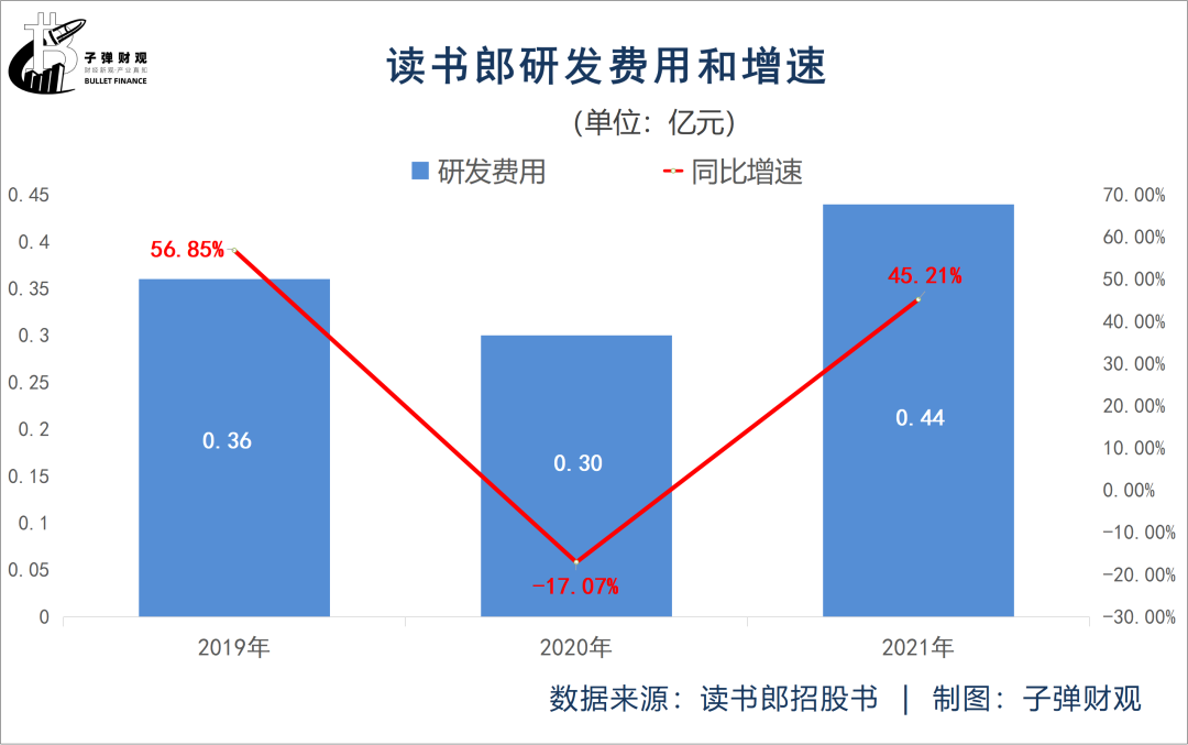 二则,读书郎的研发费用在上升。招股书显示,2021年读书郎的研发费用为0.44亿元,较上年同期的0.30亿元增长近5成,达到45.21%。
