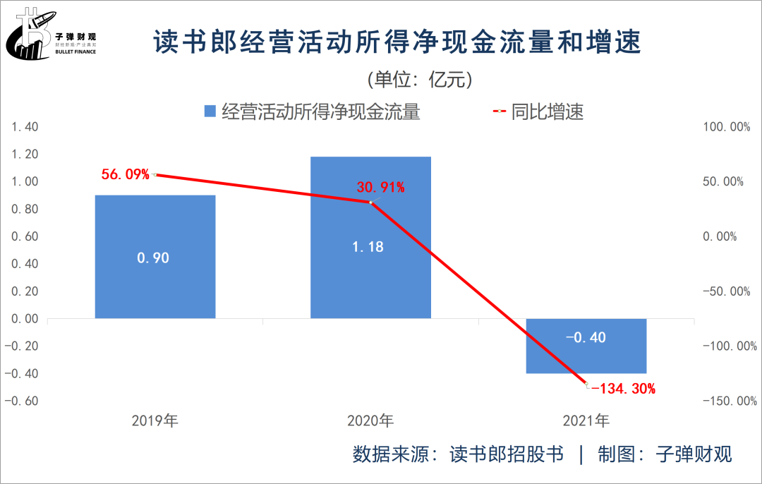 此外,读书郎也正陷入现金流吃紧的尴尬境地。根据已公开的招股书,2021年读书郎经营活动所得净现金流量为-0.40亿元,较上年同期的1.18亿元下滑134.30%,由正转负。