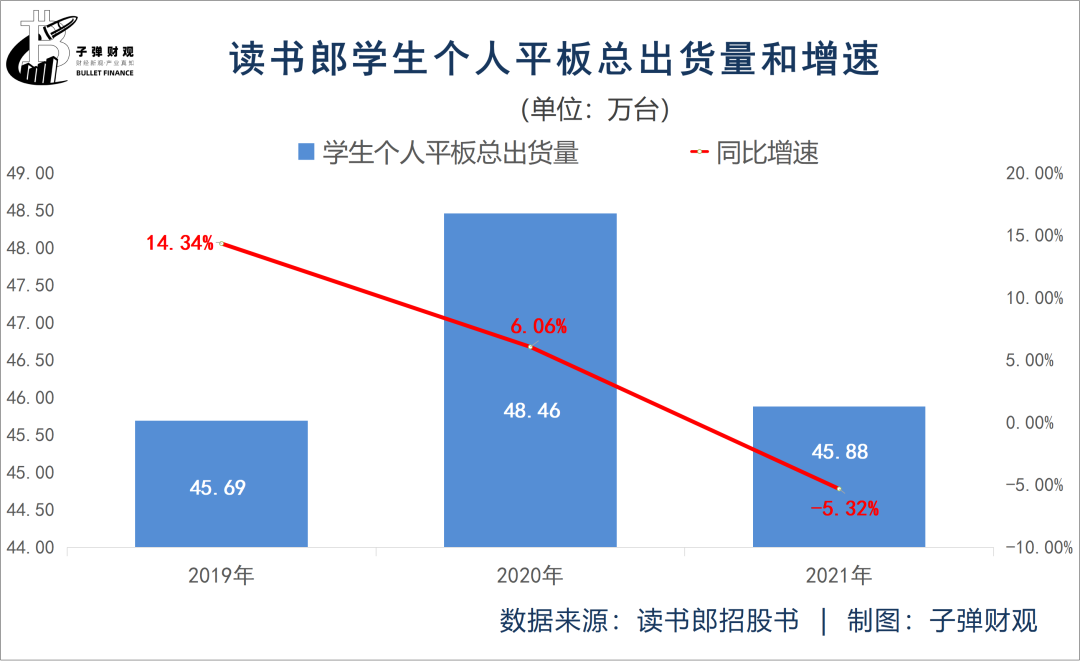 比如,读书郎学生个人平板的总出货量在减少。根据已公开的招股书,2021年读书郎的学生个人平板总出货量为45.88万台,较上年同期的48.46万台下滑5.32%。