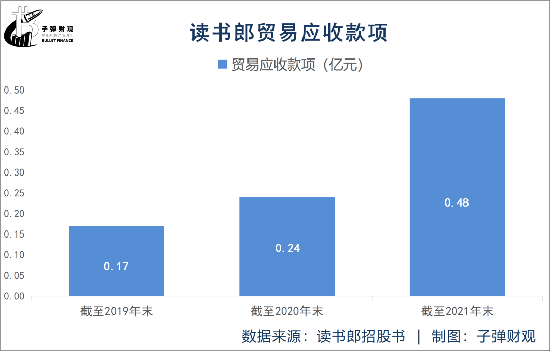 此外,引人注目的还有读书郎正面临应收账款激增的风险。根据读书郎招股书,截至2019年末,其贸易应收款项仅为0.17亿元,而截至2021年末,这一数值已飙升至0.48亿元。也就说,短短两年时间,读书郎的贸易应收款项已增近2倍,达到182.35%。