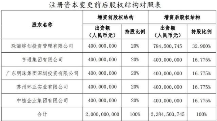 据《每日财报》了解,横琴人寿股东包括珠海铧创投资管理有限公司、亨通集团有限公司、广东明珠集团深圳投资有限公司、苏州环亚实业有限公司和中植企业集团有限公司,5家公司此前分别持股20%。此次增资获批后,珠海铧创持股比例将上升为32.9%,其他股东持股比例变为16.775%。