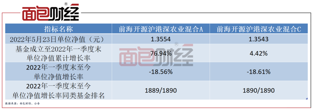 但近两个月以来,前海开源农业混合的单位净值却出现快速下跌。2022年一季度末至今(截至5月23日,下同),前海开源农业混合A份额单位净值下跌18.56%;C份额单位净值下跌18.61%,业绩表现在同类灵活配置型基金产品中分别排在倒数第2位和第1位。同期,同类基金单位净值跌幅平均值仅为-3.37%。