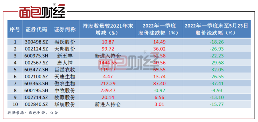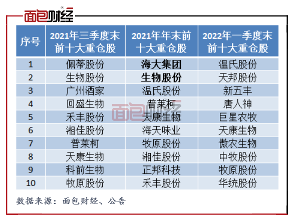 截至一季度末,海大集团、生物股份已经消失在前海开源农业混合前十大重仓股名单中,有较大概率是“杀跌”减仓。