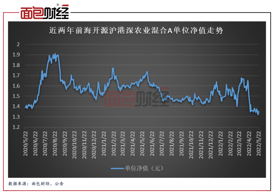 截至5月23日,前海开源农业混合A单位净值由一季度末的1.64元跌至1.36元,创出近两年内新低。