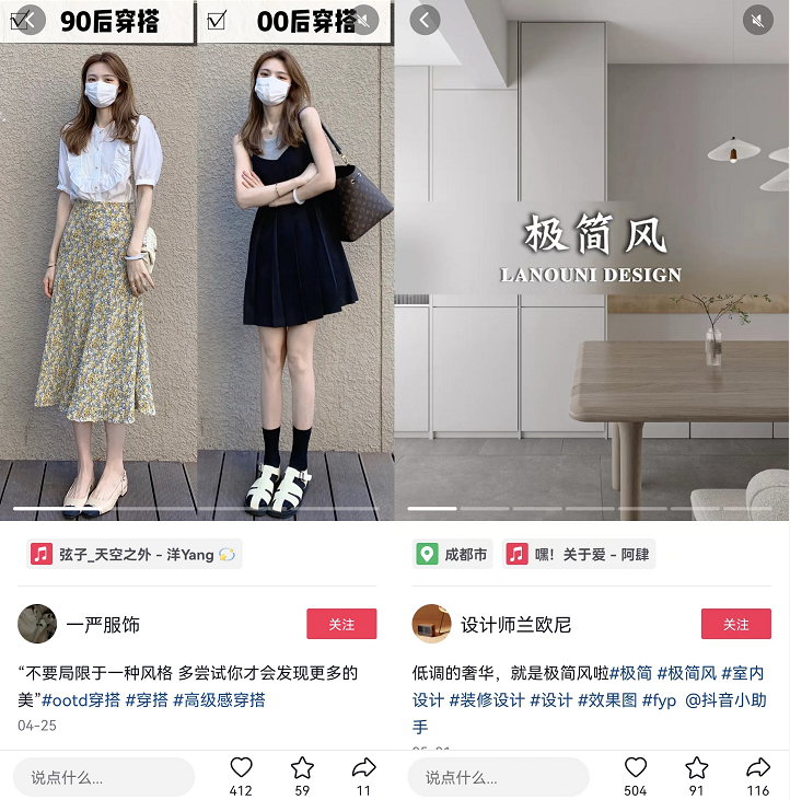 「探索」功能似乎是“像素级”模仿小红书,双瀑布流的排列方式,以封面图+文案+账号名称+点赞数的组合形式展示。不仔细看,还以为是小红书搬进了抖音。