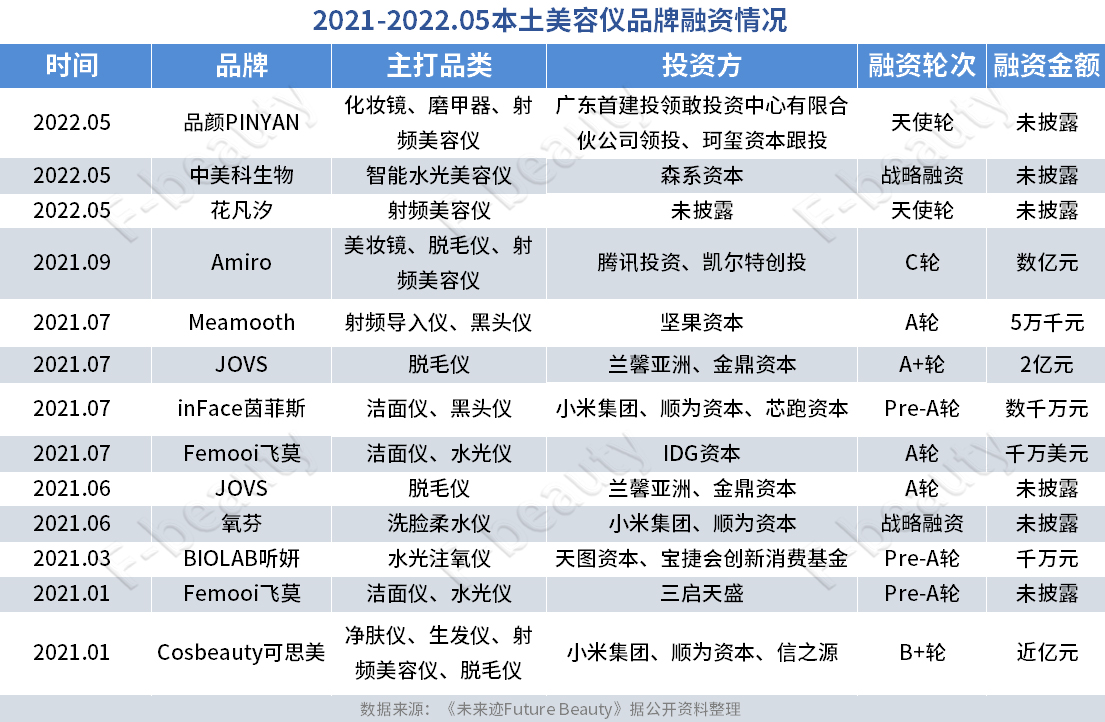 从2021年年初到今年5月,共11家本土美容仪新锐品牌获得融资,资本助力之下,再次升温家用美容仪赛道的竞争。