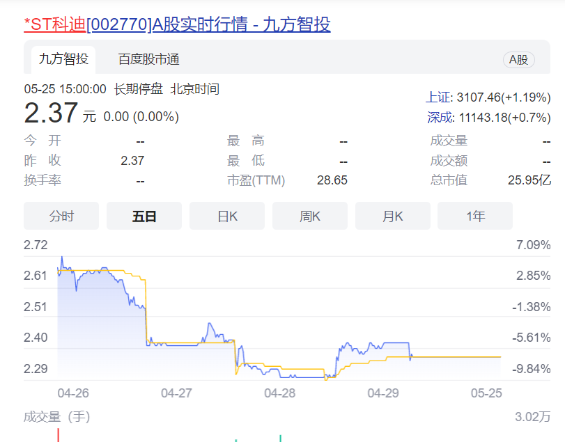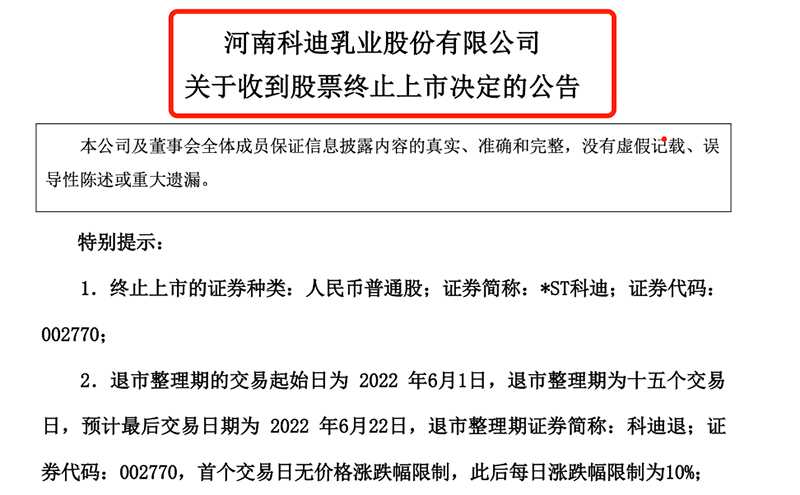 曾经是河南乳业龙头的*ST科迪(002770.SZ)保壳未果,将告别A股。在停牌前一天股价还微涨3%,自4月29日后一直停牌至今,来不及出逃的近3万股民迎来当头一棒。