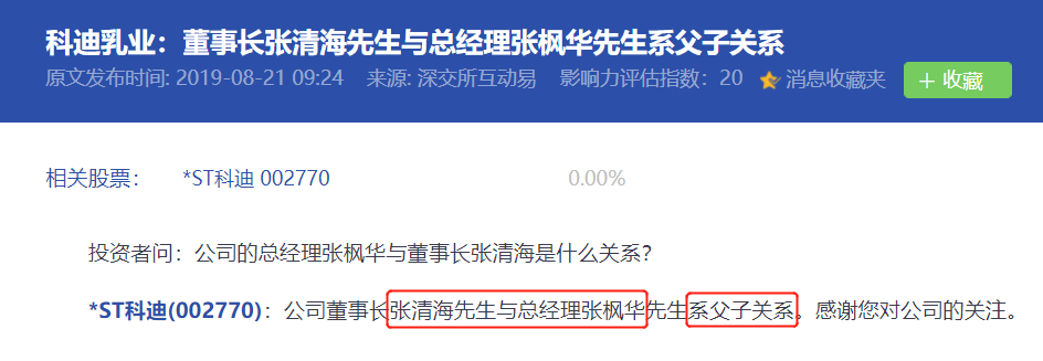 有科迪股民表示,科迪集团家族企业老板把上市公司科迪乳业作为自家的提款机,父任科迪集团老板,子任科迪乳业老板,父子串通挪用科迪乳业18亿资金,结果是老虎借猪,有借无还,从而导致科迪乳业年报非标,濒临退市。