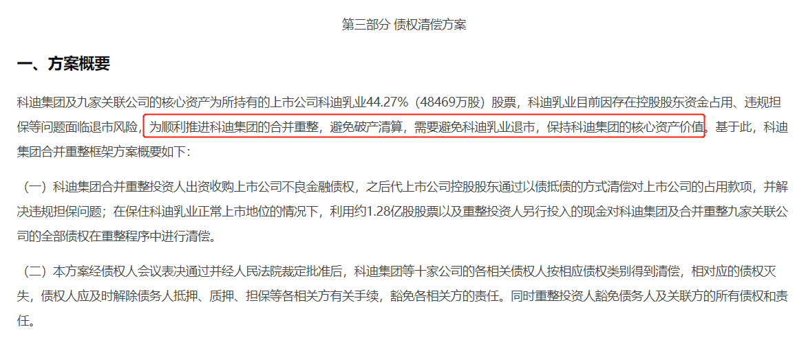 重整计划称,科迪集团及9家关联公司(不包括科迪乳业)核心资产为持有的科迪乳业44.27%股权。为顺利推进科迪集团的合并重整,避免破产清算,需要避免科迪乳业退市,保持科迪集团的核心资产价值。