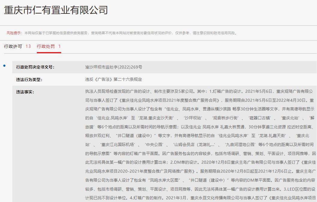 渝沙坪坝市监处字(2022)269号信息显示,重庆仁有置业与5家广告公司分别签订了重庆佳兆业·凤鸣水岸项目相关宣传推广合同。