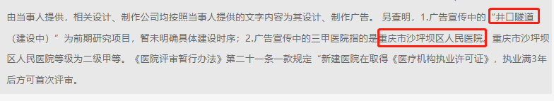 广告宣传中的三甲医院指的是重庆市沙坪坝区人民医院。但实际上,重庆市沙坪坝区人民医院等级为二级甲等。《医院评审暂行办法》第二十一条一款规定“新建医院在取得《医疗机构执业许可证》,执业满3年后方可首次评审”。