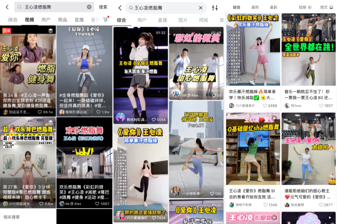 随后,《乘风破浪3》的“王心凌回忆杀”霸占话题榜,当刘畊宏女孩引爆的直播健身热潮还未退去,王心凌男孩也带动了“王心凌燃脂舞”成为了各个平台健身博主直播间的必备项目。