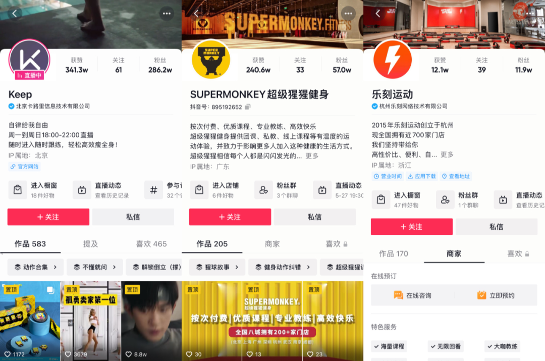 壹娱观察(ID:yiyuguancha)发现,Keep平台会员权益包含直播课。同时,Keep、超级猩猩、乐刻、莱美等健身品牌早已抖音开设官方账号并定期直播,部分教练还在个人账号开启健身直播。