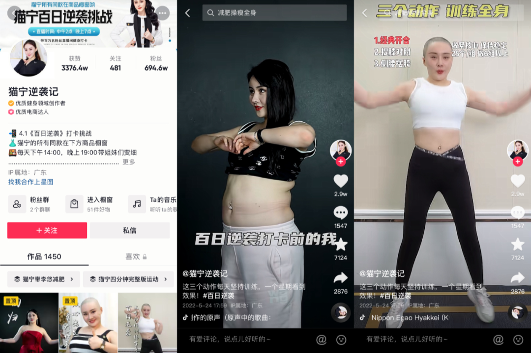 抖音博主“猫宁逆袭记”称自己曾用四个月从158斤蜕变到105斤。为了激励观众可以像她一样瘦下来,今年4月,“猫宁逆袭记”再次增肥到152斤,并削发明志,在直播间号召大家跟她一起完成“百日逆袭挑战”。这种“主动增肥-励志减肥”套路在她的直播间上演过不止一次,直播过程中,她一边运动一边不忘提醒观众点点小黄车下单购物,带货商品包括运动鞋、健身饮料等,单品最高销量已达16.1万。