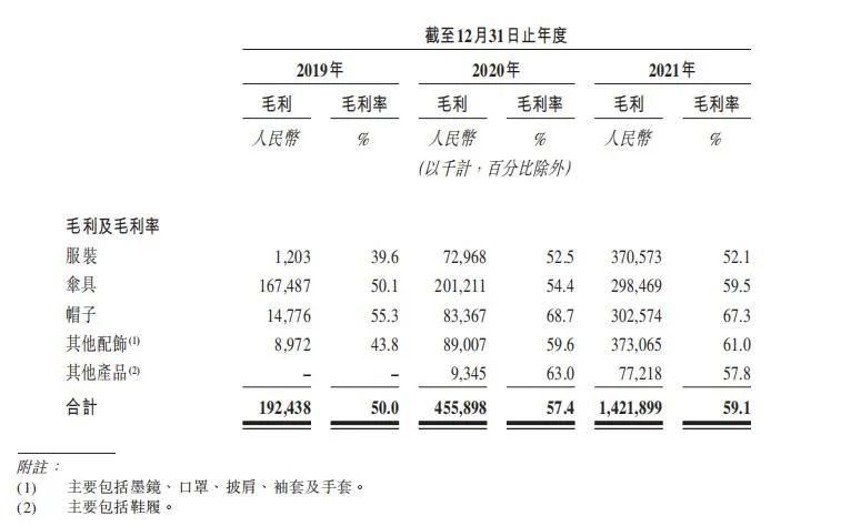 同时其伞具的营收比重,在业绩最好的2021年却下降到了20.8%,服装产品在营收达到7亿元,排在产品营收榜的第一;帽子实现营收近4.5亿元;墨镜、口罩等产品实现营收6.12亿元。