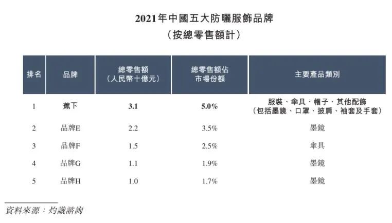 根据灼识咨询的报告,按其去年的总零售额计算,蕉下已经是当前中国第一大防晒服饰品牌。