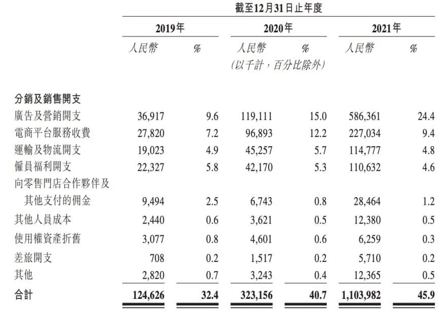 2019-2021三年间,蕉下花费在分销及销售上的开支分别为1.24亿元、3.23亿元及11.04亿元,分别占总收入的32.4%、40.7%及45.9%。