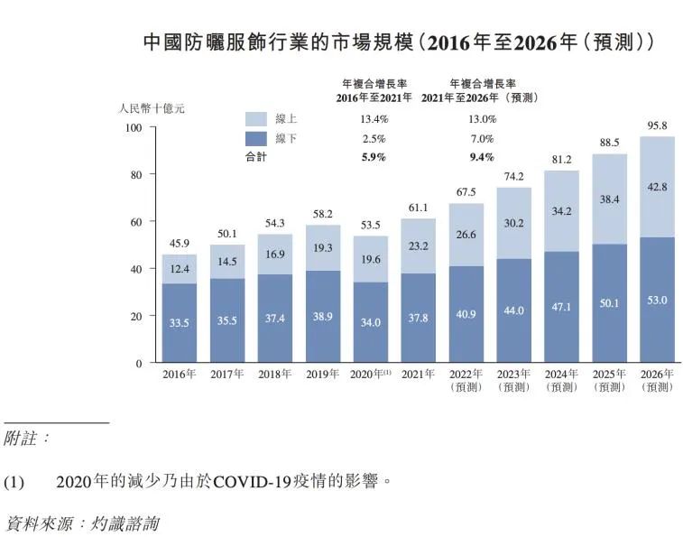 同样来自灼识咨询的报告资料,中国的防晒服饰市场规模已经由 2016 年的 459 亿元增至 2021 年的 611 亿元,按照相似的增速预计, 2026 年将达到 958 亿元。
