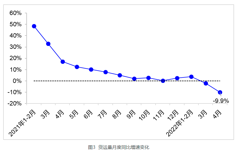 交通运输部5月26日发布4月交通运输经济运行情况。4月,完成营业性客运量3.3亿人,同比下降59.7%。其中,完成公路营业性客运量2.6亿人,同比下降43.9%;完成水路客运量432万人,同比下降76.2%。4月,36个中心城市完成客运量29.4亿人,同比下降39.9%。分方式看,公共汽电车、城市轨道交通、巡游出租车、轮渡客运量分别完成13.0亿人、12.7亿人、3.8亿人和180万人,同比分别下降38.7%、40.9%、40.5%和62.0%。4月,完成营业性货运量40.7亿吨,同比下降9.9%。其中,完成公路货运量29.6亿吨,同比下降14.3%;完成水路货运量6.9亿吨,同比增长1.5%。4月,全国港口完成货物吞吐量12.7亿吨,同比下降3.7%。其中,内、外贸吞吐量同比分别下降4.2%和2.6%。完成集装箱吞吐量2366万标箱,同比下降0.2%。4月,完成交通固定资产投资2773亿元,同比下降2.7%。其中,完成公路投资2054亿元,同比下降0.8%;完成水运投资122亿元,同比下降9.3%。