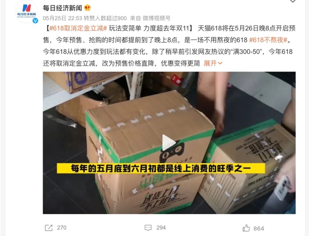 今年618率先登上热搜的就是“简化玩法”相关话题。如 #618取消定金立减# ,把烧脑的“定金立减”玩法改为了更直接的“直降预售价格”,折扣看着清晰多了。再比如 #618不熬夜# ,各平台普遍提前到晚8点就开启预售对非熬夜党相当友好。