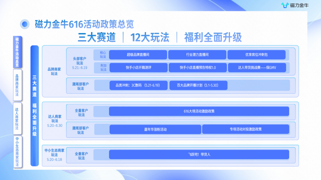 快手延续往年的差异化打法,重点在616节点做文章祭出覆盖3大赛道、12大玩法的“616实在购物节”,包括超级品牌直播间、行业潜力直播间、优享席位冲刺包三大赛道,以及快手小店开箱测评、快手小店直播预告特权、达人带货挑战赛等核心玩法。