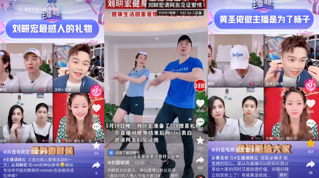 比如前段的520,抖音邀请时下流量最盛的刘畊宏夫妇发起“520为爱健身计划”。看似日常的直播里,刘畊宏向老婆示爱的同时冷不丁植入了I DO钻戒、FILA运动服、Ulike脱毛仪等产品,带动相关商品电商销量。而令其与钟丽缇夫妇、张歆艺夫妇、黄圣依夫妇等进行直播连线,相当于在帮助这些“小主播”复刻夫妻俩的成功模式。