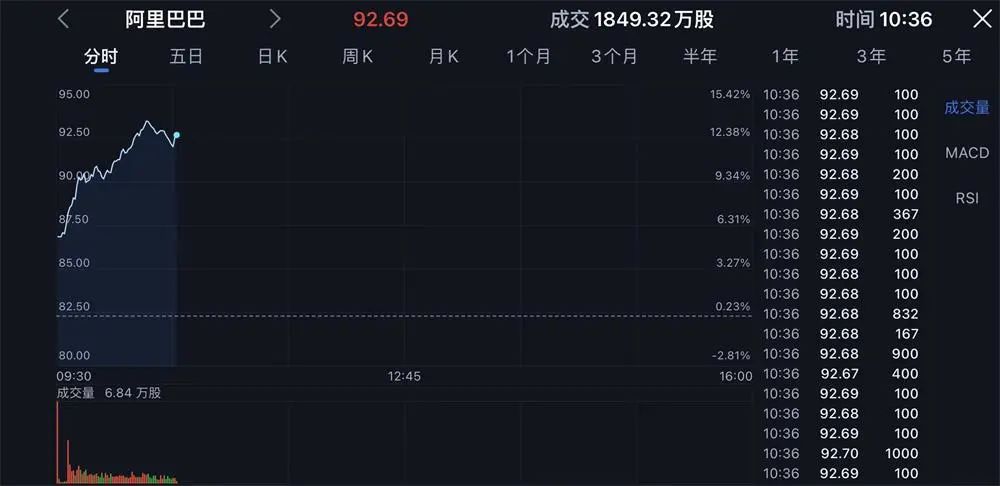 截至北京时间22点30前后本文成稿,阿里巴巴美股开盘后股价涨超10%。