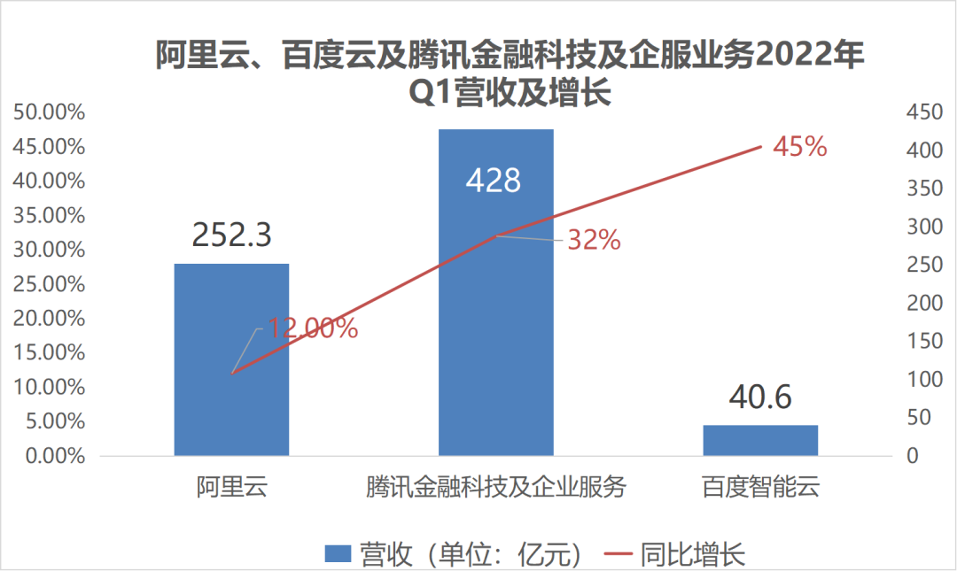 今日,百度也公布了财报,财报显示百度智能云同比增长45%,达到40.6亿元;腾讯在前几天公布了财报,腾讯云的营收情况被包含在“腾讯金融科技及企业服务”板块,这一板块整体营收达428亿元,同比增长32%,首次成为腾讯最大收入来源。