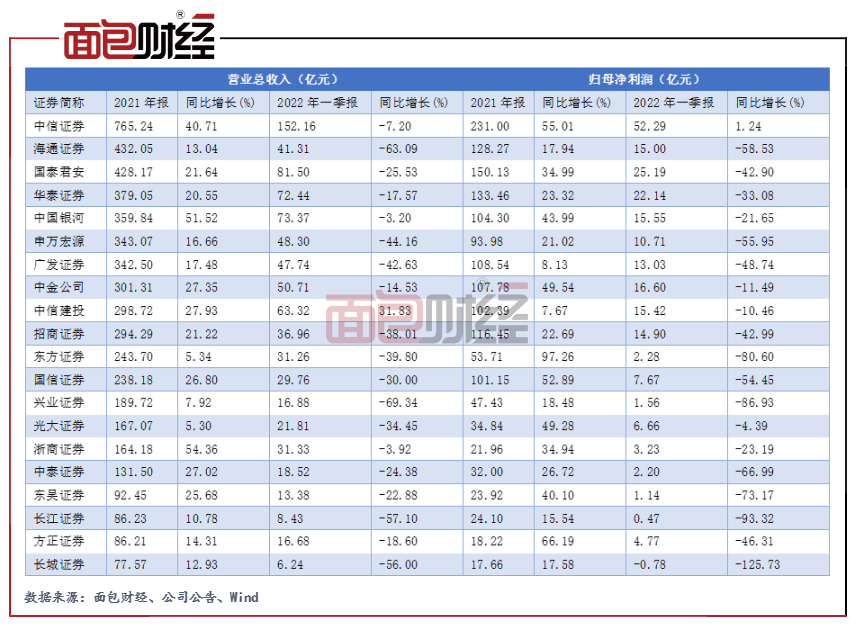 图3:2021年和2022年一季度大型券商营收、归母净利润