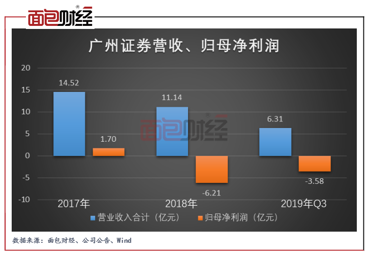首先,早在并购发生之前,2018年至2019年前三季度,作为标的资产,广州证券已产生大额亏损,归母净利润分别为-6.21亿元和-3.58亿元。