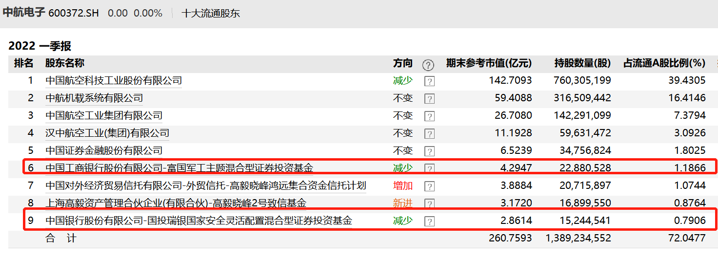 中航电子一季度报显示,前十大流通股东中,富国军工主题、高毅晓峰2号、国投瑞银国家安全三只基金分别位列第6、8、9位。不过,富国军工主题在一季度减持了263.46万股,国投瑞银国家安全在一季度减持了183.59万股。而高毅晓峰2号基金则新进成为前十大股东。