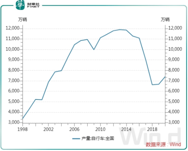 根据Wind数据,在2010年-2016年期间,全国自行车产量达到了历史巅峰,年产量均超过1亿辆,其中2014年有接近1.2亿辆的产量。也就是在这段时间里,国内的骑行经济处于最强周期,新闻上那些骑遍全国或者环球骑行的大神,就是集中在这个阶段。