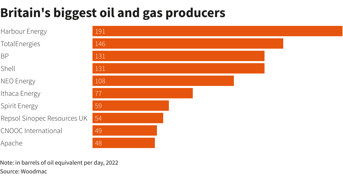 以石油日当量产量看,英国排名前五的油气生产企业为Harbour Energy、道达尔、bp、壳牌、NEO Energy。