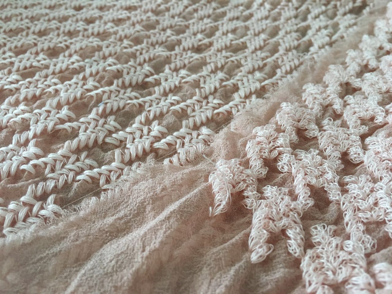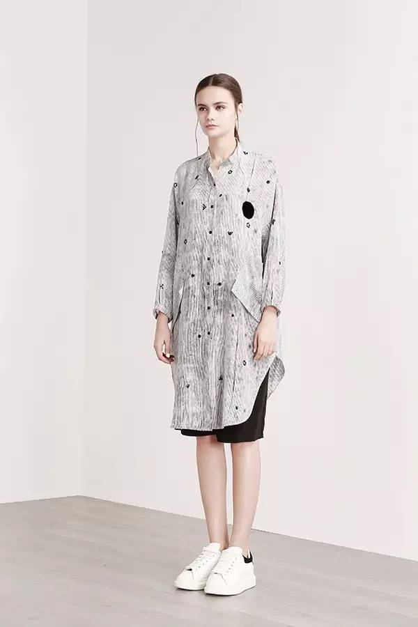 △张洁研发设计的一款面料,在乔其纱的面料上添加了绣花的工艺,平整的视觉上叠加了肌理感。