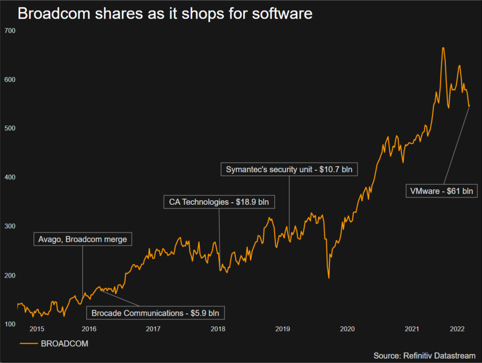▲博通几次重大并购节点与股价变化(图源:路透社)