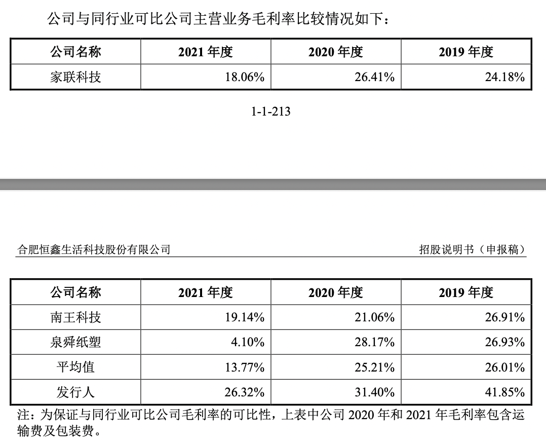 报告期内,恒鑫生活的主营业务毛利率(2020年、2021年剔除运输费及包装费)分别为 41.85%、40.65%和36.17%,2021年下滑较大在于原材料价格上涨。