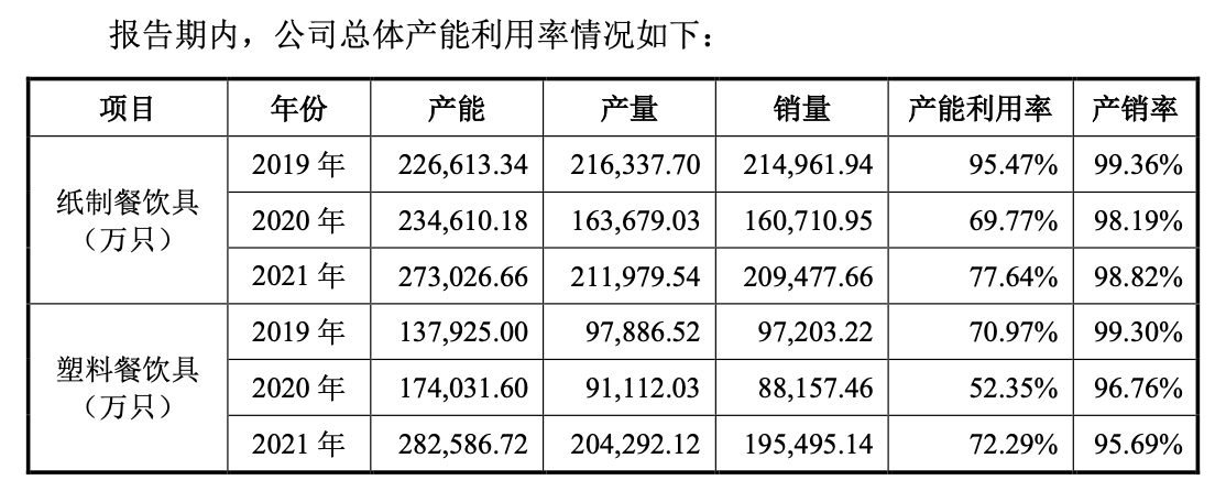 其中,年产3万吨PLA可堆肥绿色环保生物制品项目计划生产产品包括PLA 杯、杯盖、杯套、纸碗、刀叉勺和吸管等,“3万吨”具体对应多少只公司并未说明,但报告期内纸质餐饮具的产能利用率整体下滑,2021年仅77.64%,同时塑料餐饮具的产能利用率有所波动并且不高,因此新增该募投项目或也将被监管层关注。
