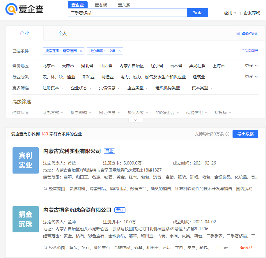 有了新需求,也就催生出了新生意。据爱企查显示,近1~2年新成立的公司中,经营范围包括“二手奢侈品”的企业有180家,经营范围包括“奢侈品鉴定”的有77家,俨然已经成了一个值得挖掘的流量洼地。