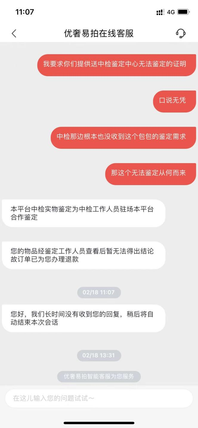 安琦觉得自己被欺骗了,“我明明要求的是中检鉴定,我付的也是要中检的鉴定费,为什么最后是优奢易拍给鉴定的,而且我问客服要中检工作人员的名字和工号,她还说没法提供。”这之后,安琦自行联系了中检进行鉴定,“人家说可以做鉴定,也出了鉴定结果,这包的确是假的,我也把它给退了,但我生气的是,优奢易拍耽误我这么长时间,还让我损失了来回运费,你要一早说实物鉴定不了的话,我也可以通过其他途径再买个真的不是吗,结果中间平白耽误二十多天,害得我生日的时候也没背上......”