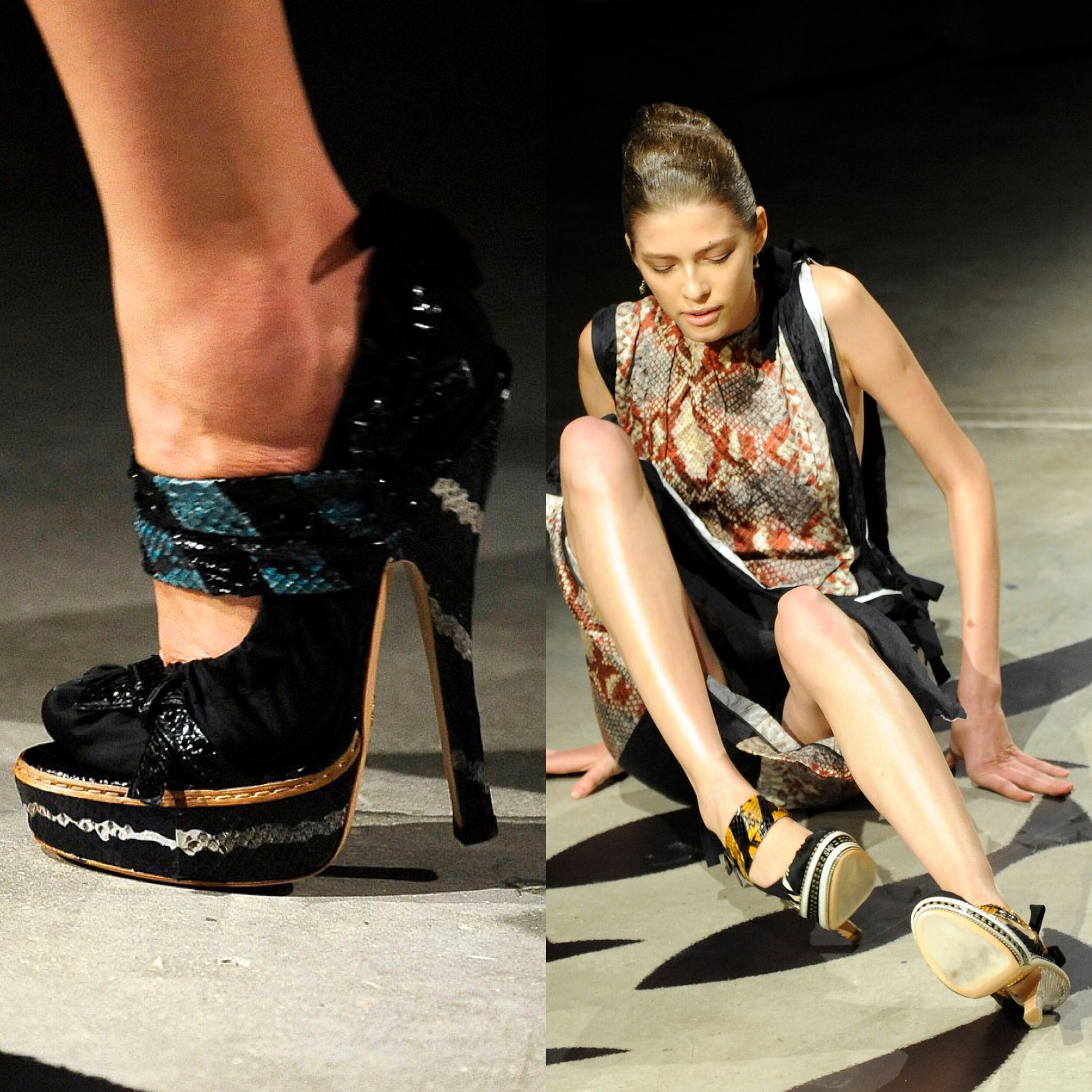 普拉达的防水台高跟鞋同样令人生畏。2009年春夏时装秀上,设计师Miuccia Prada设计了一系列带有复古造型的系带高跟鞋。高高的防水台外加极易让脚打滑的边缘,使得不少模特在秀场上接连跌倒。