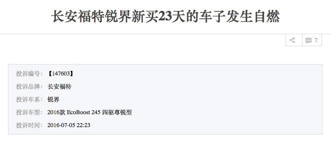 近日,笔者在车质网上看到一宗关于长安福特锐界自燃的投诉。车主在湖北武汉某4S店全款购买了一辆长安福特锐界2016款2.0T四驱尊锐型,落地价为36.6万元。