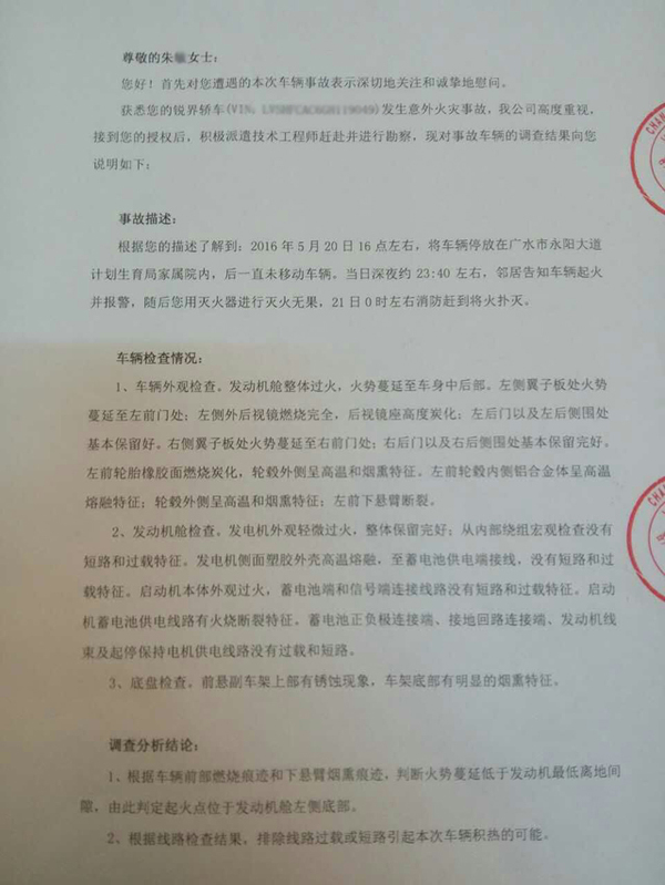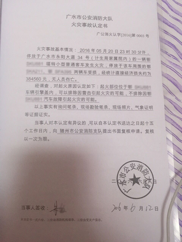 笔者在网上搜索相关信息,发现有部分媒体对此做了相关报道。根据当地公安消防队出具的火灾事故认定书,车辆起火的部位位于车辆的引擎盖内,可以排除因雷击引起火灾的可能,不排除汽车故障引起火灾的可能。