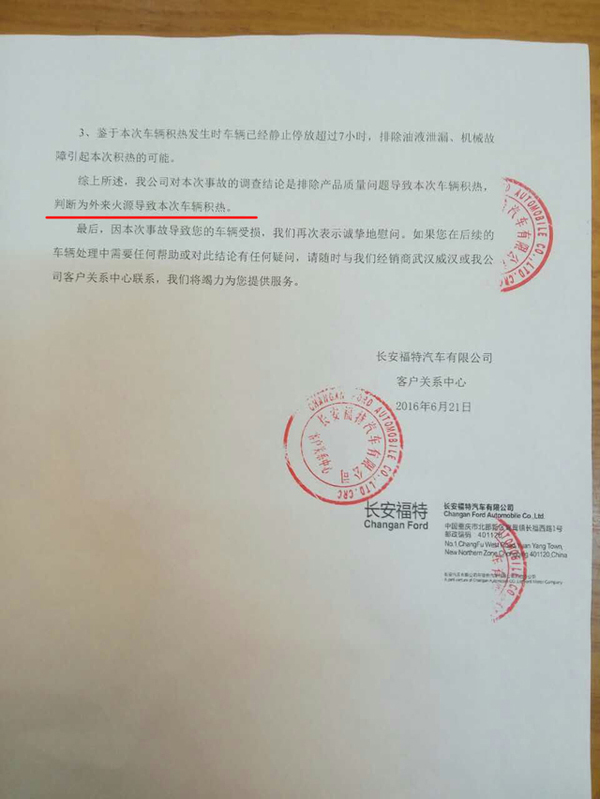 而长安福特也在要求车主签下相关委托书后派人到现场勘查,10天后给出一份鉴定报告。不过,让车主意外的是,厂家给出的报告显示:根据线路检查结果,排除线路过载或短路引起本次车辆起火,判断为外来火源导致本次车辆积热。按照长安福特的说法,就是车辆自燃不是我车辆的质量问题,这个锅我不背。