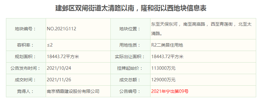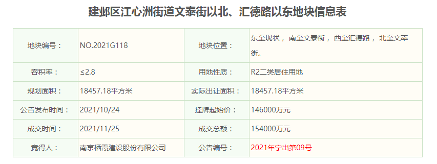 该地块于去年11月份由栖霞建设竞得,成交总价15.4亿元,楼面价29799元/㎡,未来住宅毛坯房销售限价42200元/㎡,预计今年下半年上市。