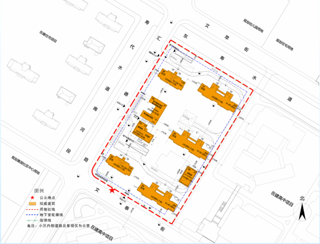 该地块规划6栋12-13F小高层产品,另外还规划有一个下沉式庭院,物业、配电、快递用房等,最大楼间距约43米。