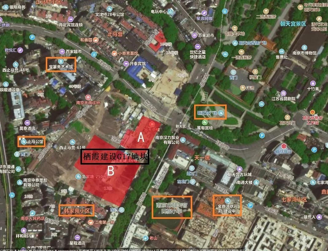 项目位于秦淮区朝天宫街道,西至止马营,北至建邺路,东至地铁5号线朝天宫站,南至现状韩家苑小区、石鼓路小学附属幼儿园。