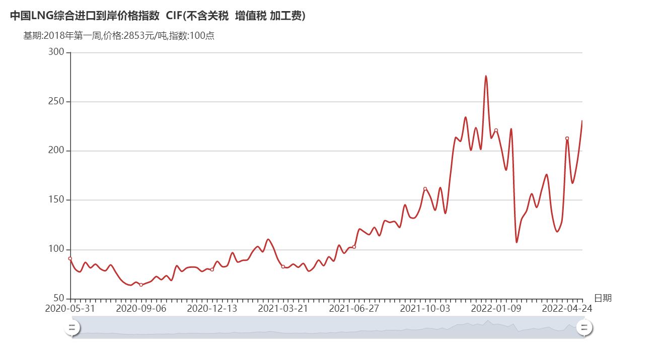 海关总署全球贸易监测分析中心和上海石油天然气交易中心联合发布的中国LNG综合进口到岸价格指数显示,5月16日-22日,中国LNG综合进口到岸价格指数为231.16点,环比上涨22.2%,同比上涨149.91%。