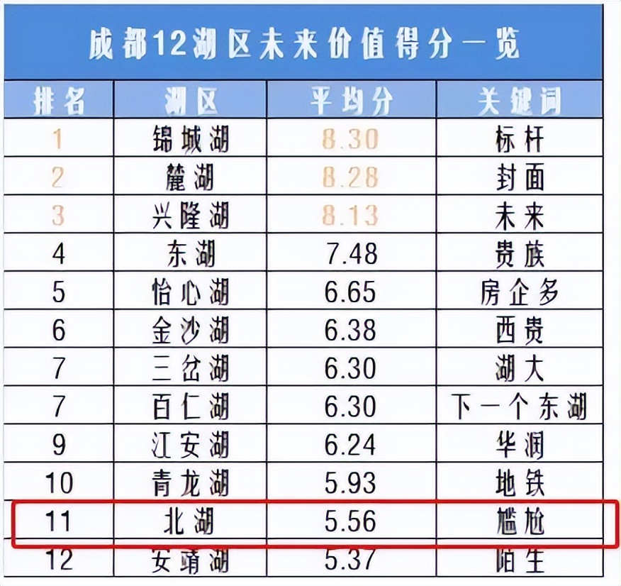 凤凰网曾经推出的“成都未来湖居生活价值排行”大调查中,北湖排名成都第11位,关键词为“尴尬”。与其它“高富帅”湖居板块相比,目前的北湖,整体发展是相对滞后了。